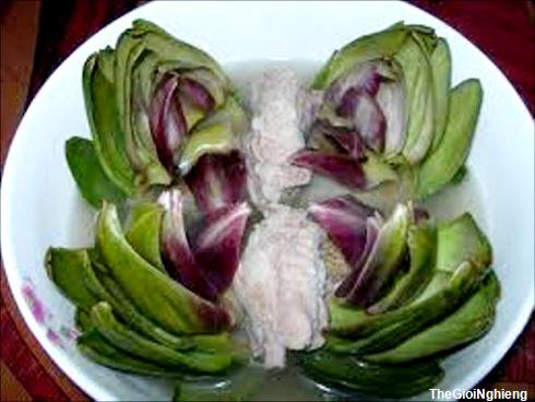 Khi đun nước giò lợn, người nấu khéo léo cho thêm củ hành tím để tạo mùi thơm, giúp cho giò thấm vị. Sau khi giò đã chín, cho hoa atiso vào, đun tiếp 10 phút cho hoa chín vừa, là món canh atiso hầm giò lợn đã hoàn thành. Đây là món ăn thơm mát là sự hòa quyện vị ngòn ngọt của cánh hoa atiso, thịt giò lợn mềm thấm vị, thêm chút nước canh đậm đà.