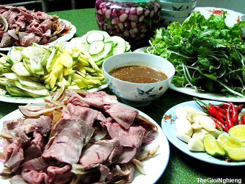 Khi đến quán bán thịt bê thui, khách có thể gọi thịt bắp, thịt ba chỉ, thịt mông, da chế biến thành các món như xáo, gân, xương, bún tái…