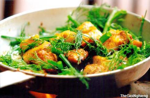 Tiếp theo phi hành tím cho thơm, bỏ thêm ít hành lá cắt khúc lớn, rau thì là cắt khúc và nước ướp cá vào chảo dầu, xào lên. Cuối cùng cho thịt cá đã nướng vào xào, đảo nhẹ tay để thịt cá không bị nát. Nêm nếm cho vừa ăn. Chả cá ăn kèm với bún, bánh tráng nướng, mắm tôm, cơm dừa xắt mỏng, đậu phộng chiên và dưa chua.